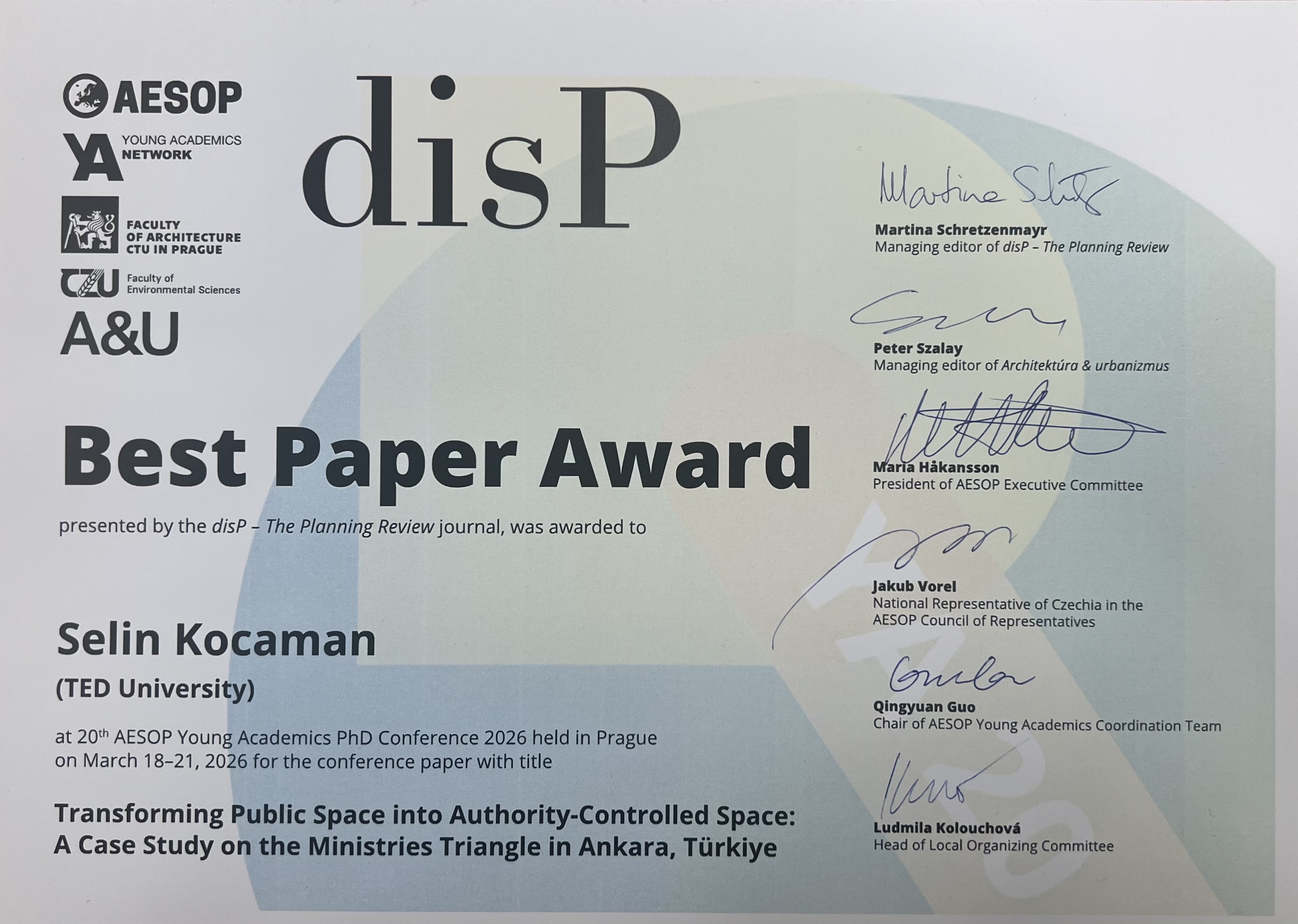 Doktora öğrencimiz Selin Kocaman'ın 18-21 Mart tarihleri arasında katıldığı 20. AESOP Young Academics PhD Konferansı'nda sunduğu "Transforming Public Space into Authority-Controlled Space: A Case Study on the Ministries Triangle in Ankara, Türkiye" isimli makaleyle en iyi makale ödülünü almıştır. Kendisini tebrik ediyoruz.